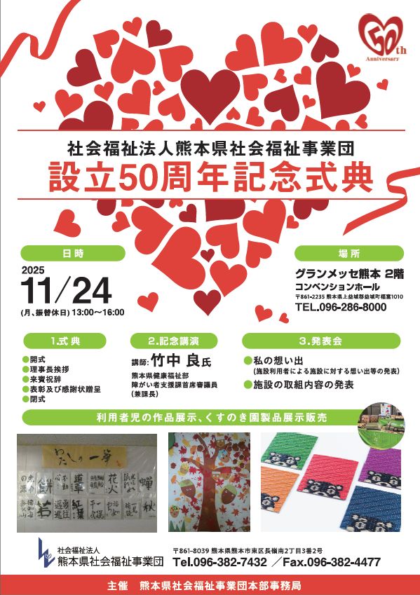 法人設立50周年記念式典を令和7年11月24日に開催します 2025 10/29 50周年 お知らせ トップ 一覧 新着情報 2025-10-29 50周年 お知らせ トップ 一覧 新着情報 50周年記念ロゴマーク選考結果発表! この記事を書いた人 管理者 関連記事 50周年記念ロゴマーク選考結果発表! 2025-07-25 身体障害者能力開発センターの第三者評価結果を公開します。 2025-07-24 令和6年度事業報告・決算関係資料を公開します。 2025-07-24 正職員採用試験(令和7年1月26日実施)の合格者を発表します。 2025-02-05 正職員(総合職)を募集しています(終了しました) 2024-11-29 くすのき園の栄養士又は管理栄養士を募集しています。(終了しました) 2024-11-22 令和4年度事業報告・決算等を公表します。 2023-07-12 求人案内募集(くすのき園) 2023-05-23